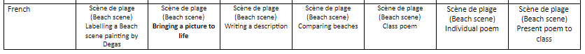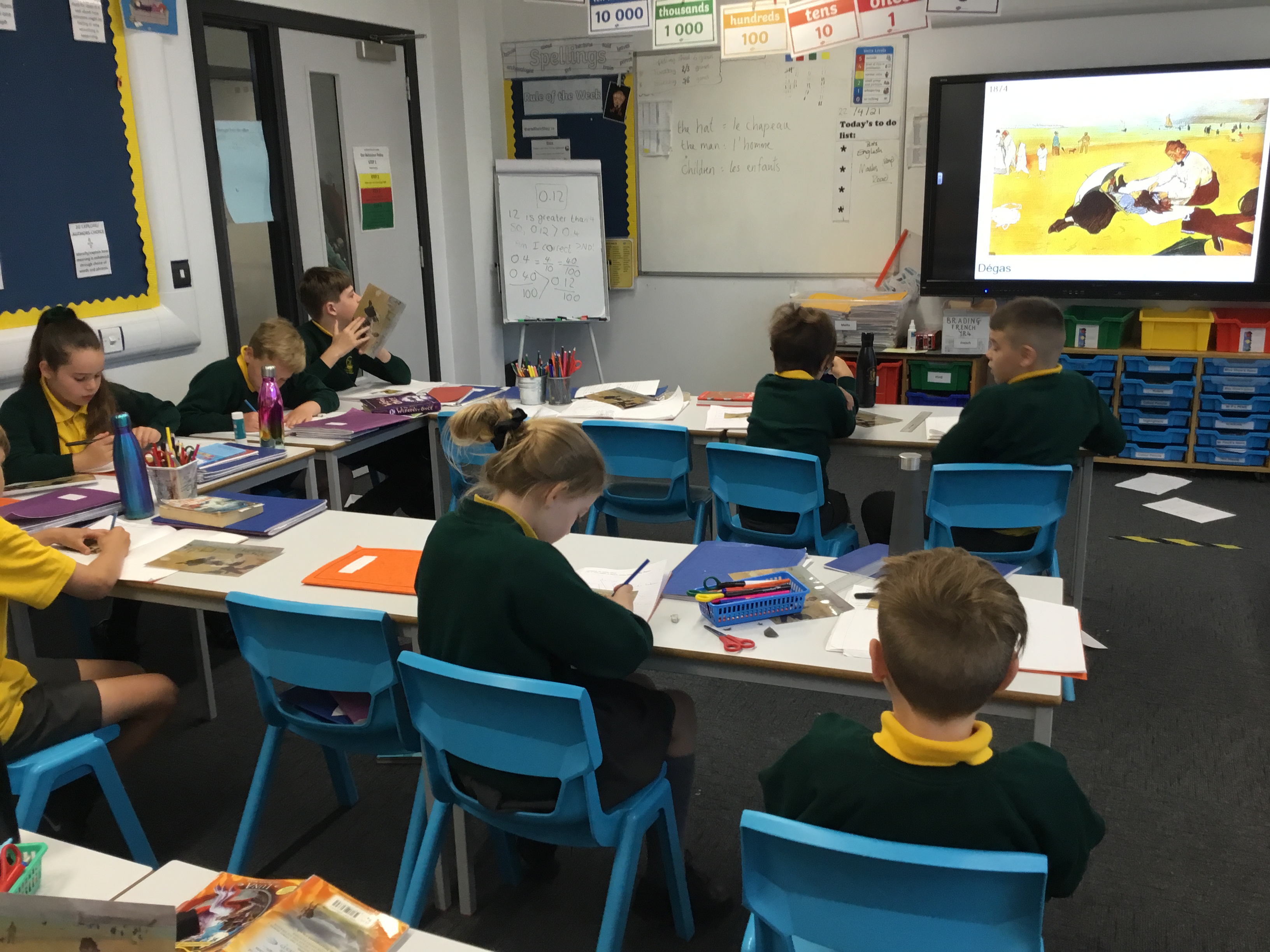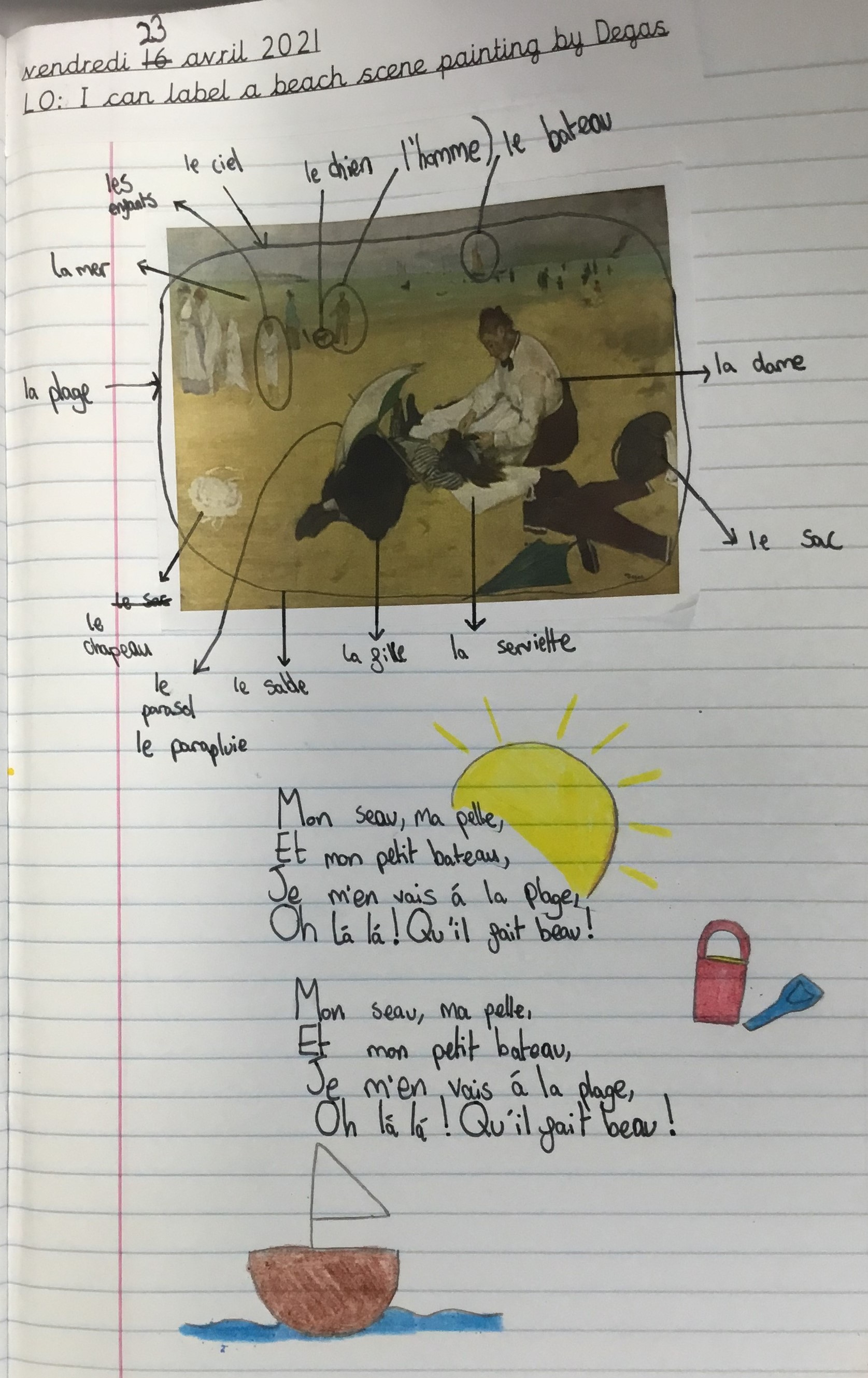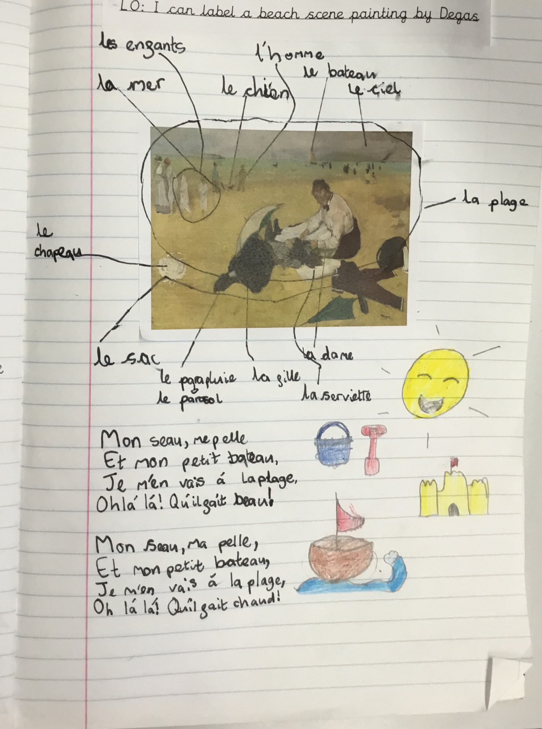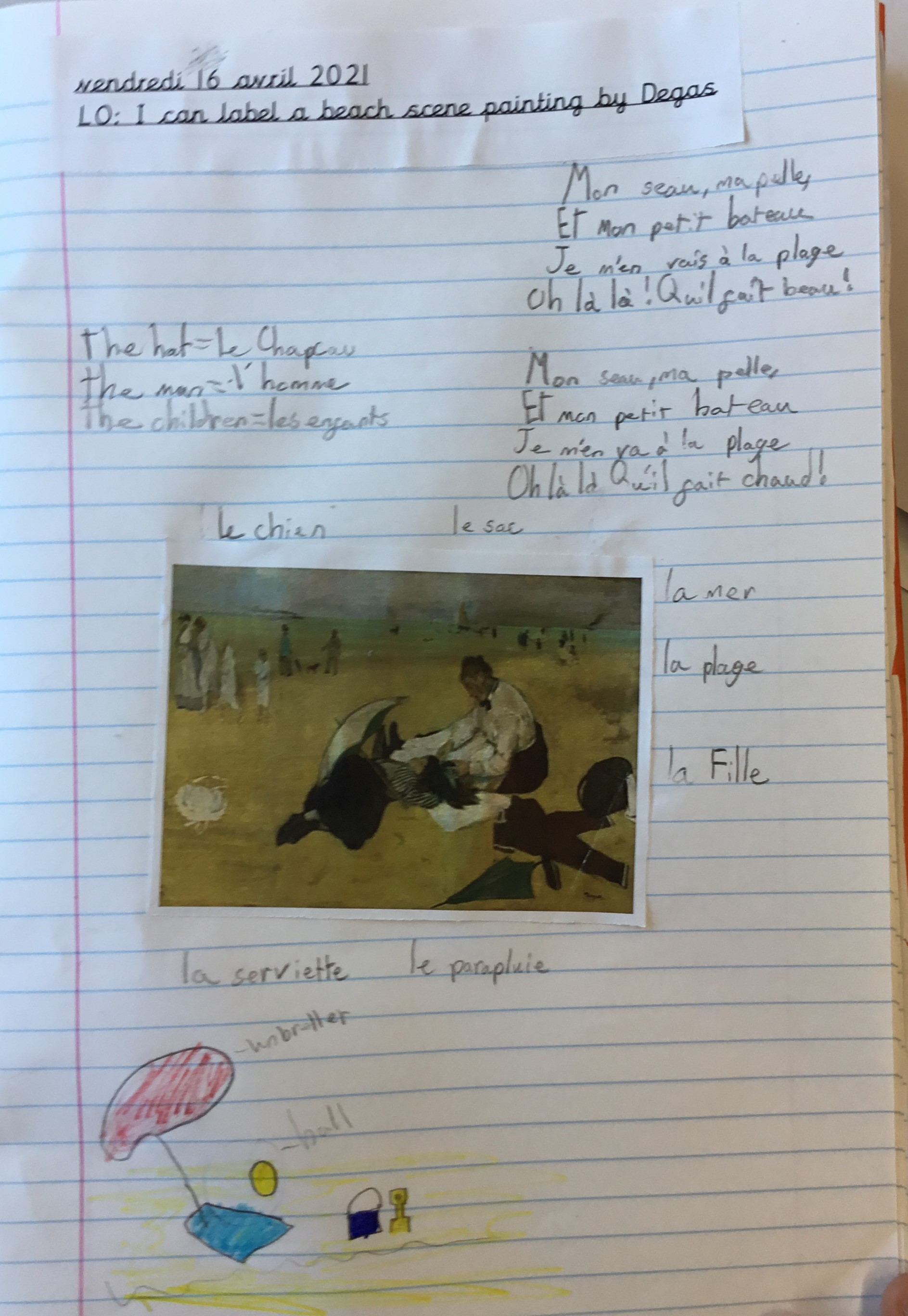 This half term, year 5 will be learning vocabulary around a beach scene. They will use a well known painting by Degas as the starting point of the topic. They will revise colours and move on to writing a description of the painting and comparing beaches. We will write a poem together as a class, then individual poems will be written. These will then be presented to the class.